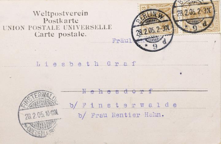 Werbepostkarte; Grafik, monochrom Rückseite: Kartuschenbild mit Mädchen und Schreibmaschine Smith Premier; Text: Mamma ich lerne die Smith Premier, dann brauche ich nicht in die Schule!; Leerraum mit Schreibmaschine beschrieben Vorderseite: adressiert an Fräulein Graf, Nehesdorf; zwei Briefmarken Deutsches Reich 3 Pf., Poststempel Berlin 28.2.1905 / Finsterwald 28.2.1905