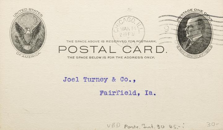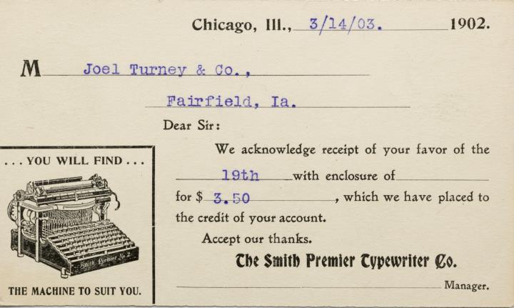 Postkarte mit Werbebild; Grafik, monochrom Rückseite: Schreibmaschine Smith Premier Nr. 2; vorgedruckter Mitteilungstext, maschinenschriftlich ergänzt, datiert 3/14/03 Vorderseite: adressiert an Joel Turney & Co. Fairfield; vorgedrucktes Postwertzeichen U.S. Postage One Cent; Poststempel Chicago/Mar 14 1903