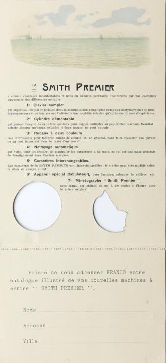 dreiteilige Antwortpostkarte; Grafik, polychrom Werbeteil: Schiffskabine; Kaiser Wilhelm II und Mann (beide in Uniform) mit Schreibmaschine Smith Premier, zwei Bullaugen/Fenster mit Sicht auf die offene See; Text: [...] la Marine impériale d'Allemagne et l'Empereur à bord du "Hohenzollern" emploient la machine Smith Premier / Filialenverzeichnis und Werbetext Antwortkarte mit vorgedruckter Anschrift und Bestelltext