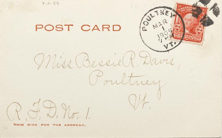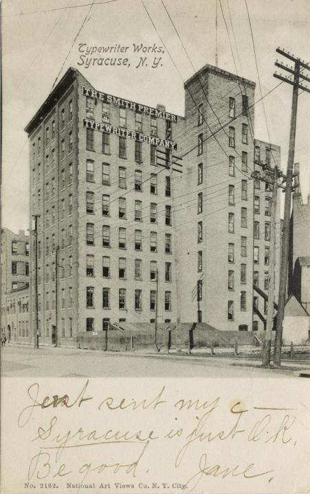 Illustrierte Postkarte; Fotografie, monochrom; No. 2162 Rückseite: Gebäudeansicht der Schreibmaschinenfabrik Smith Premier, Freileitungen im Vordergrund; Leerraum beschrieben Vorderseite: adressiert an Miss Davis, Poultney; Briefmarke U.S. Postage Two Cent; Poststempel Poultney/Mar 1 1905