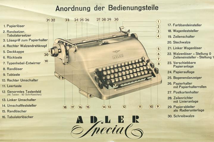 Aufrollbare Wandkarte mit Darstellung der Schreibmaschine Adler Special Papier mit Baumwollgewebe verstärkt, mit Holzleisten und Aufhängeschnur