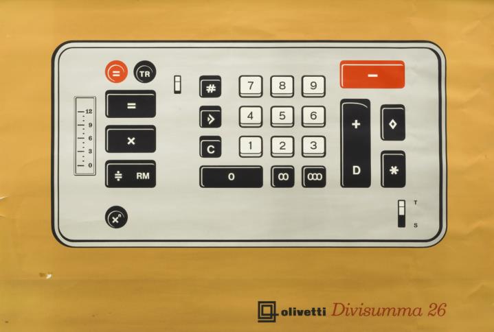Lehrtafel mit Tastaturansicht für Rechenmaschine Olivetti Papier mit Hängeleisten aus Metall