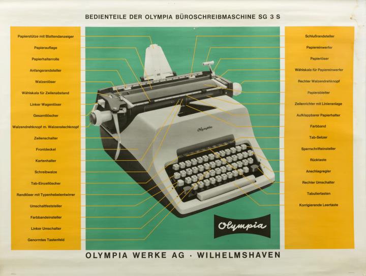 großformatige aufrollbare Lehrtafel mit Darstellung der Bedienteile der Schreibmaschine Olympia SG 3S; Nr. 5/01/066/01 Papier gewebeverstärkt, mit Hängeleisten aus Holz