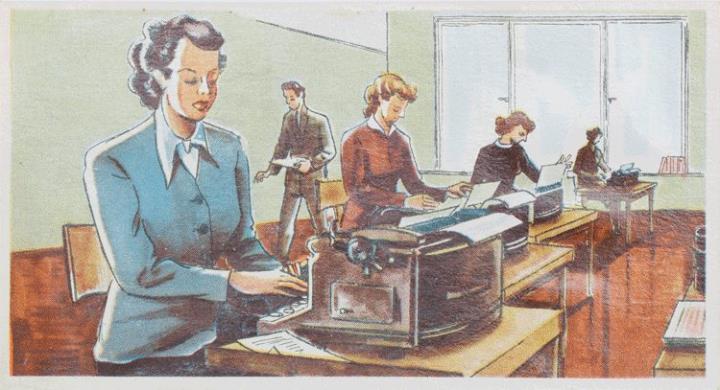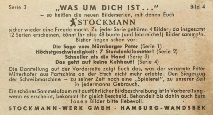 Reklamesammelbild (Stockmann); polychrom Serie 3, Bild 4. Der Siegeszug der Schreibmaschine Rückseite: Erläuterungstext zum Sammelbild