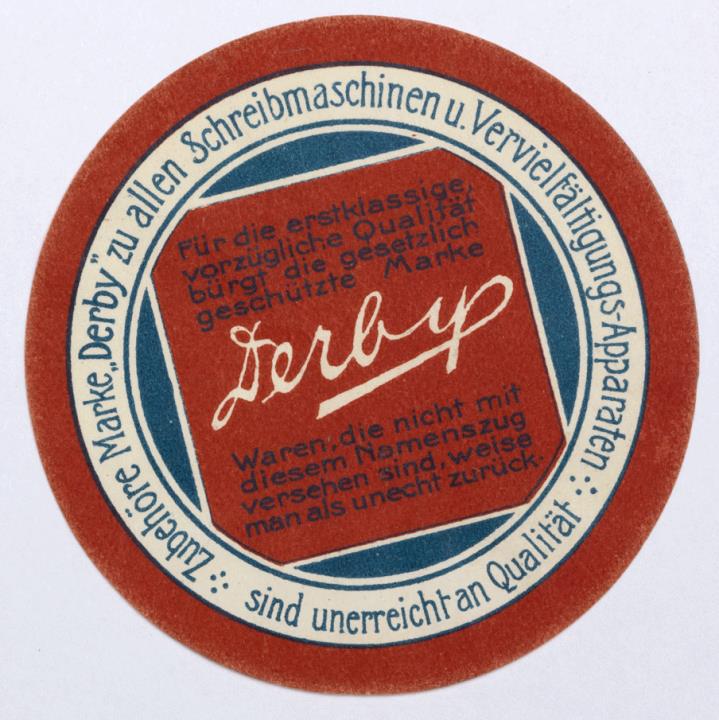 Siegelmarke für Schreib- und Büromaschinenzubehör Derby; rund, polychrom Text: Zubehöre Marke "Derby" zu allen Schreibmaschinen u. Vervielfältigungs-Apparaten sind unerreicht an Qualität