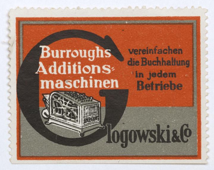 Reklamemarke/Werbemarke für Rechenmaschine Burroughs; rechteckig, polychrom Text: vereinfachen die Buchhaltung in jedem Betriebe