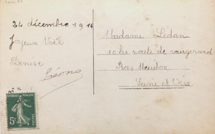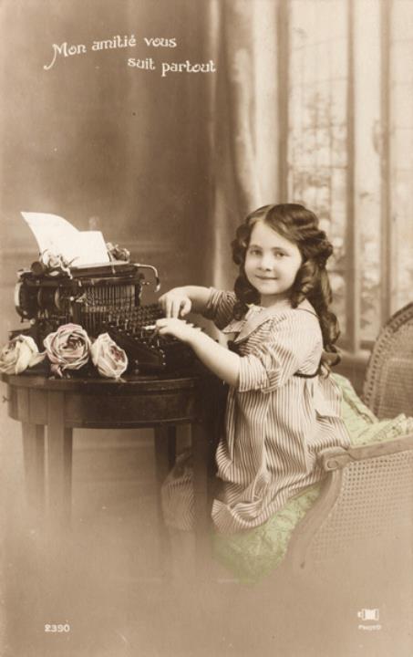 Illustrierte Postkarte; Fotografie, koloriert; Nr. 2390 Rückseite: Mädchen mit Schreibmaschine, Blick zum Betrachter, Blumen als Dekoration Vorderseite: beschrieben, datiert 24.12.1914; adressiert an Madame Ledan, Bas Meudon; Briefmarke Postes Francaises 5c