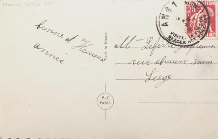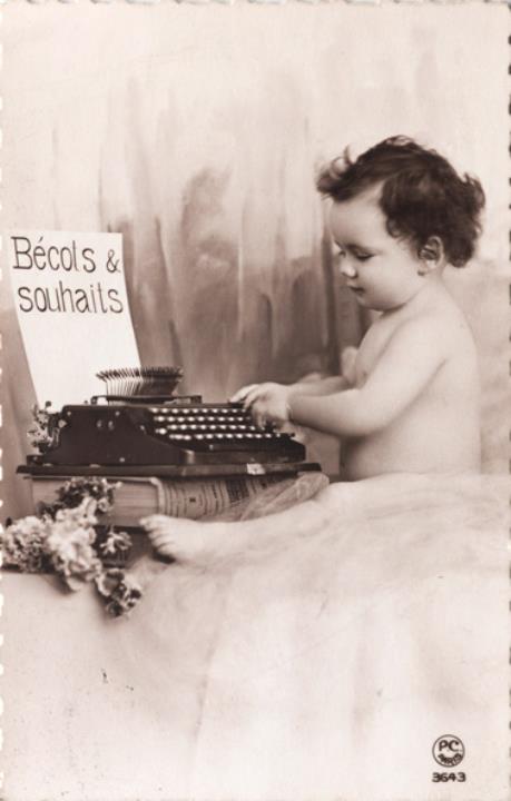 Illustrierte Postkarte; Fotografie, monochrom; Serie PC Paris 3643 Rückseite: Baby mit Schreibmaschine Vorderseite: beschrieben; adressiert an Mm Lefévre, Liege; Briefmarke Belgique 25c; Poststempel Ans