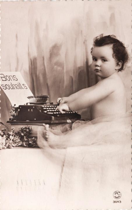 Illustrierte Postkarte; Fotografie, monochrom; Serie PC Paris 3643 Rückseite: Baby mit Schreibmaschine Vorderseite: beschrieben; adressiert an Monsieur et Madame Pellens, Liege; Briefmarke Belgique 50c; Poststempel Liege/2 I 1933