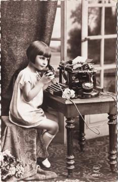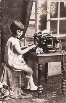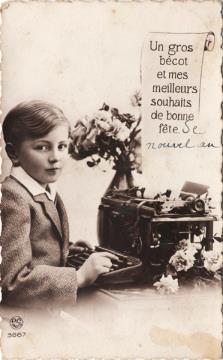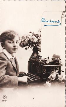 Illustrierte Postkarte; Fotografie, monochrom; Serie PC Paris 3867 Rückseite: Junge mit Schreibmaschine, Blick zum Betrachter, Blumen als Dekoration; beschrieben Vorderseite beschrieben und adressiert