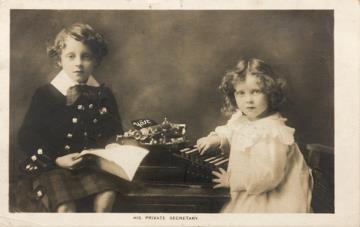 Illustrierte Postkarte; Grafik, Fotografie, monochrom Rückseite: vier Kinder mit Schreibmaschinen; Leerraum beschrieben Vorderseite: vorgedruckter Text; adressiert an C. R. Selby Esq., Barnes; Briefmarke Postage Revenue (U.K.) Half Penny; Poststempel De 20 1906