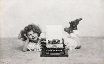 Illustrierte Postkarte; Fotografie, monochrom Rückseite: Mädchen am Boden liegend mit Schreibmaschine Vorderseite nicht beschrieben