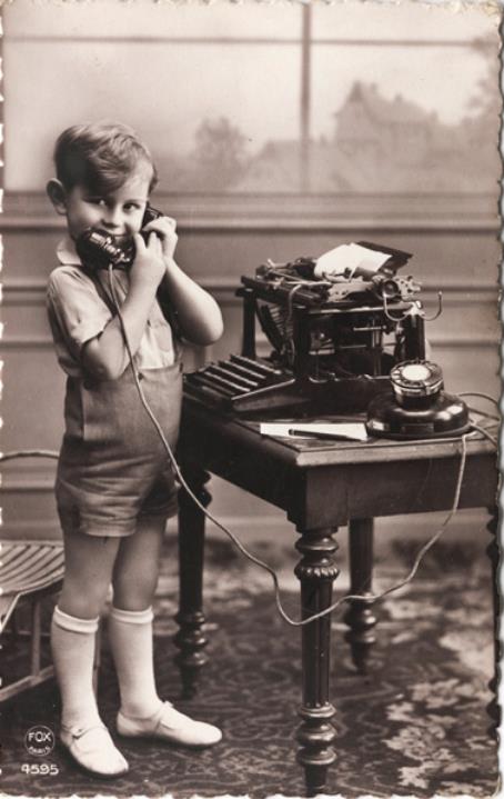 Illustrierte Postkarte; Fotografie, monochrom; Serie Fox 4595 Rückseite: Junge neben Schreibmaschine beim Telefonieren, Blick zum Betrachter Vorderseite: beschrieben; adressiert an Roger Bollen, Antwerpen; Briefmarke Belgique 10c; Poststempel Selzaete/12 XI 19xx