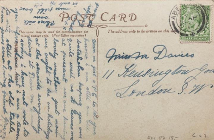 Illustrierte Postkarte; Fotografie, monochrom; Serie E.-G. Rückseite: Baby mit Schreibmaschine Vorderseite: beschrieben; adressiert an Miss Davies, London; Briefmarke Postage Revenue (U.K.) Half Penny; Poststempel Aberdare