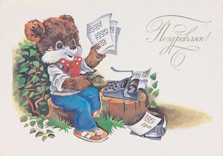 Illustrierte Postkarte (Glückwunsch); Grafik, polychrom Rückseite: Bär mit Schreibmaschine Vorderseite nicht beschrieben