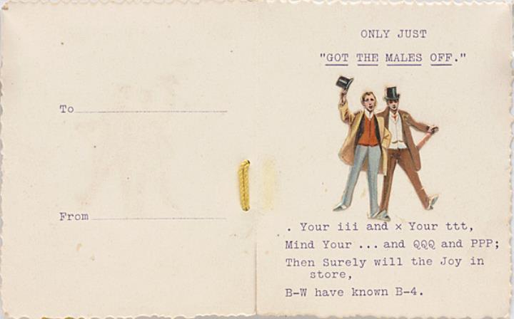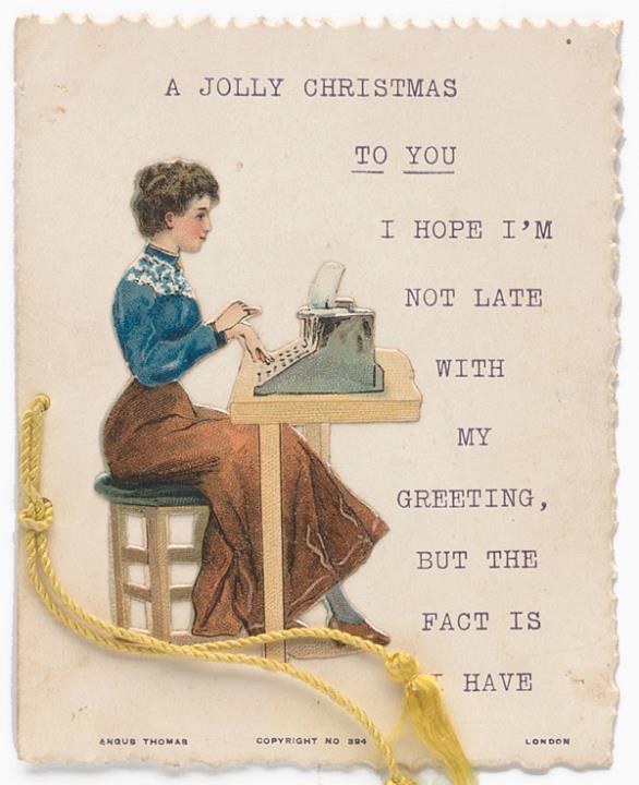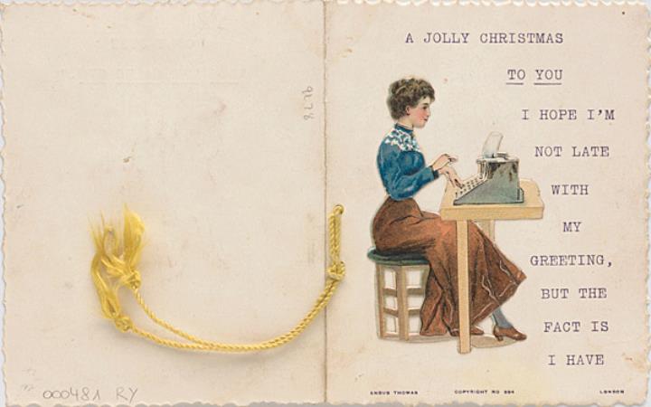 aufklappbare Karte (Weihnachten), Geschenkanhänger; Grafik, Mischtechnik, polychrom copyright No. 394 Angus Thomas, London Vorderseite: Frau mit Schreibmaschine Innenteil: zweier Männer mit Zylinderhut, Text in Fortsetzung