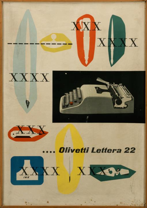 Werbeplakat für Schreibmaschine Olivetti Lettera 22 Papier auf Holzplatte kaschiert, gerahmt