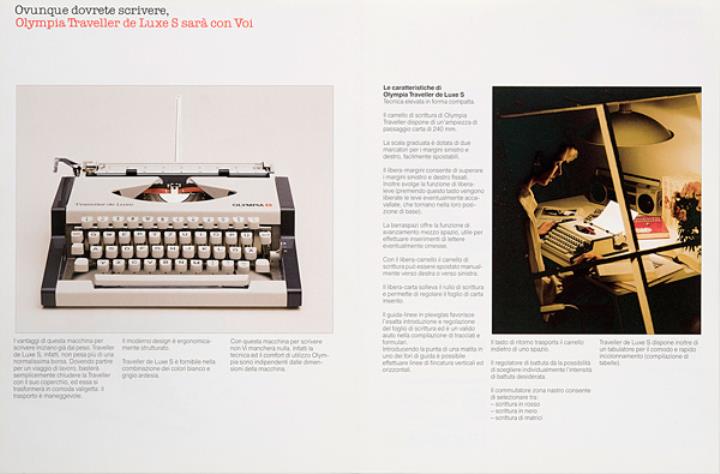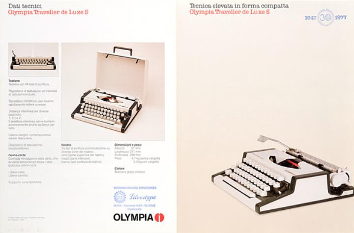Faltprospekt für Schreibmaschine Olympia Traveller de Luxe S Tecnica elevata in forma compatta Nr. 5/11 030/24-02.87 mit Stempel: Silvestype, Merano, zwei Exemplare