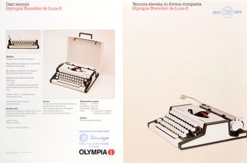 Faltprospekt für Schreibmaschine Olympia Traveller de Luxe S Tecnica elevata in forma compatta Nr. 5/11 030/24-02.87 mit Stempel: Silvestype, Merano