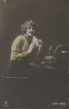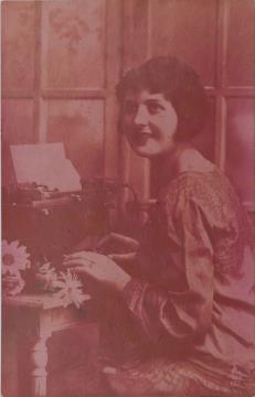Illustrierte Postkarte; Fotografie, koloriert; Serie WH H.142/3 Rückseite: Frau mit Schreibmaschine, Blick zum Betrachter Vorderseite nicht beschrieben