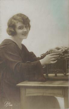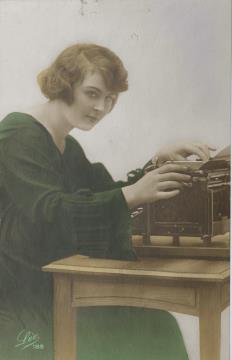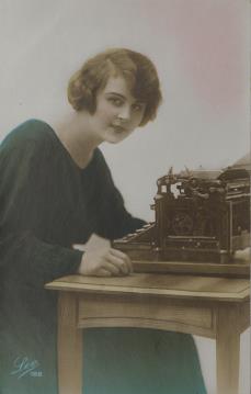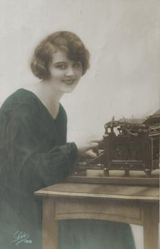 Illustrierte Postkarte; Fotografie, koloriert; Serie Leo 188 Rückseite: Frau mit Schreibmaschine, Blick zum Betrachter Vorderseite nicht beschrieben
