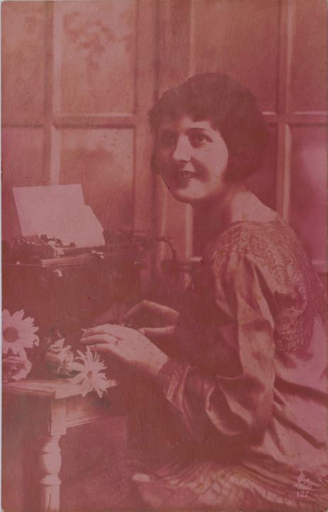 Illustrierte Postkarte; Fotografie, getönt; Serie LC Paris 127 Rückseite: Frau mit Schreibmaschine, Blumen als Dekoration Vorderseite beschrieben