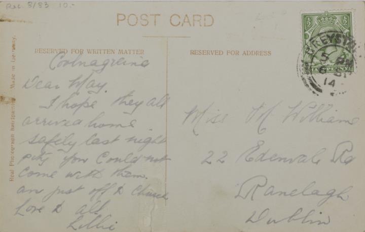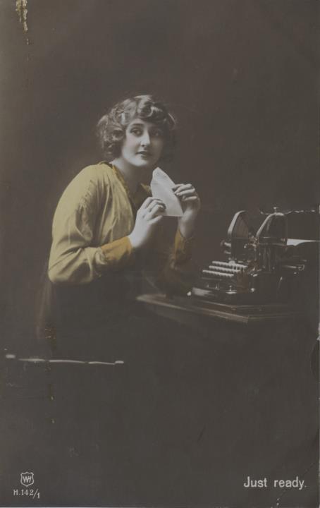 Illustrierte Postkarte; Fotografie, koloriert; Serie WH H.142/1 Rückseite: Frau mit Schreibmaschine Vorderseite: beschrieben; adressiert an Miss Williams, Dublin; Briefmarke Postage Revenue (U.K.) Half Penny; Poststempel 1914