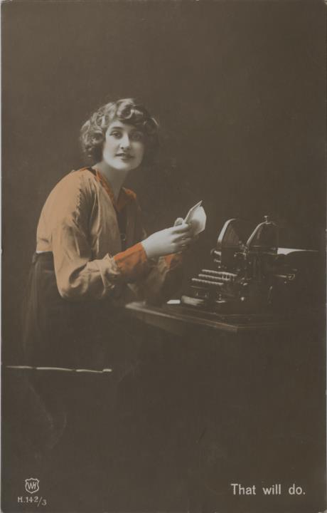 Illustrierte Postkarte; Fotografie, koloriert; Serie WH H.142/3 Rückseite: Frau mit Schreibmaschine, Blick zum Betrachter Vorderseite nicht beschrieben