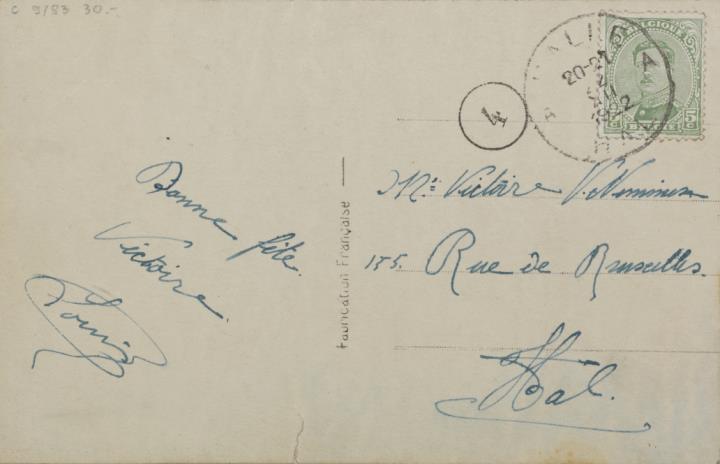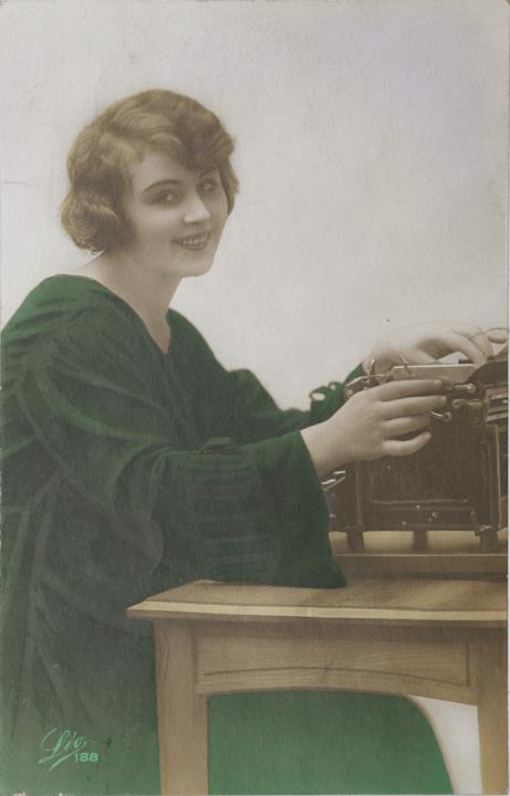 Illustrierte Postkarte; Fotografie, koloriert; Serie Leo 188 Rückseite: Frau mit Schreibmaschine, Blick zum Betrachter Vorderseite: beschrieben; adressiert; Briefmarke Postes Belgique 5c; Poststempel Marchienne au Pont 22 XII 1922