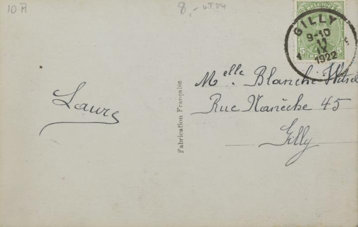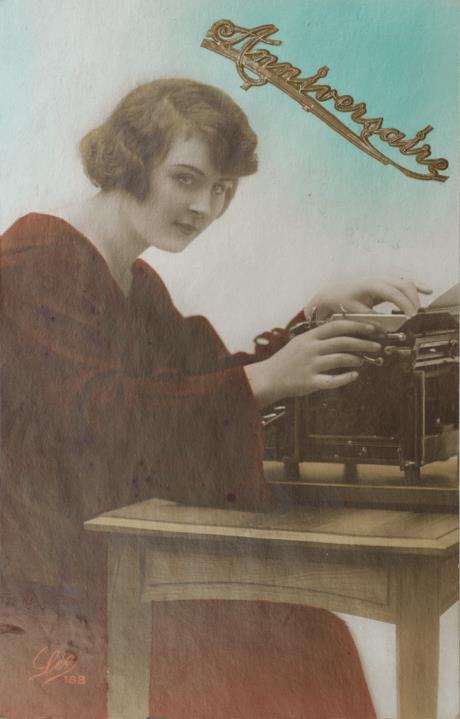 Illustrierte Postkarte (Geburtstag); Fotografie, koloriert; Serie Leo 188 Rückseite: Frau mit Schreibmaschine Vorderseite: beschrieben; adressiert an M.elle Witsel, Gilly; Briefmarke Postes Belgiqueue 5c; Poststempel Gilly 11 IX 1922