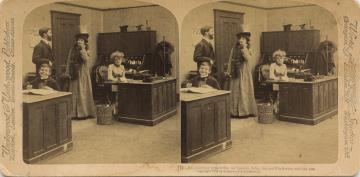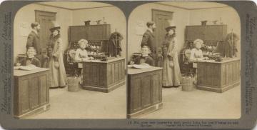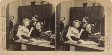 Stereofotografiekarte, monochrom Büroszene; Vorgesetzter mit Ehefrau, Bürojunge, Sekretärin mit Schreibmaschine; Text (1): No, your new typewriter isn't pretty John, but you'd better try and like her. Copyright 1902 by Underwood & Underwood