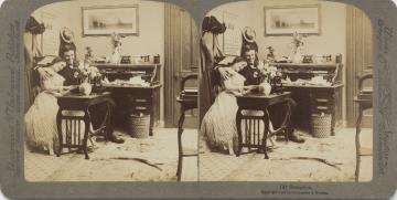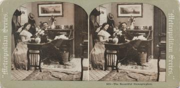 Stereofotografiekarte, monochrom; Metropolitan Series 825 Büroszene; Vorgesetzter mit Pfeife, Sekretärin mit Schreibmaschine