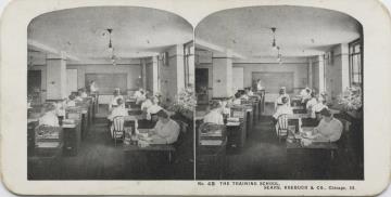 Stereofotografiekarte, monochrom; No. 48 Vorderseite: Unterrichtszimmer mit Lehrerin, Sekretärin und Schülerinnen mit Schreibmaschine; weiterer Text: Sears, Roebuck & Co., Chicago III. Rückseite: Werbetext für die Schule