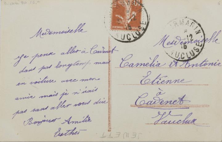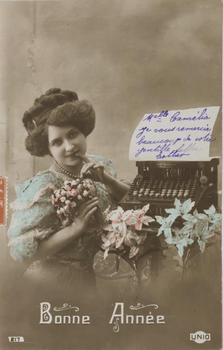 Illustrierte Postkarte; Fotografie, koloriert; Serie Unio 217 Rückseite: Frau mit Schreibmaschine, Blick zum Betrachter, Blumen als Dekoration Vorderseite: beschrieben; adressiert an M.elle Antonie, Vaucluse; Briefmarke Postes Francaises 10c; Poststempel 31.12.15