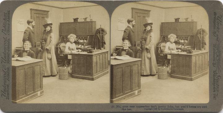 Stereofotografiekarte, monochrom Büroszene; Vorgesetzter mit Ehefrau, Bürojunge, Sekretärin mit Schreibmaschine; Text (1): No, your new typewriter isn't pretty John, but you'd better try and like her. Copyright 1902 by Underwood & Underwood