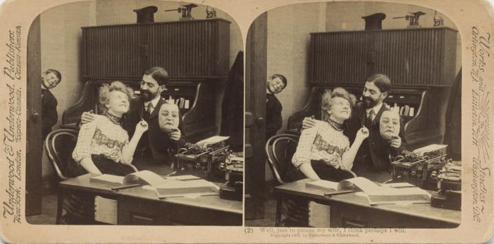 Stereofotografiekarte, monochrom Büroszene; Vorgesetzter mit Maske und Sekretärin, Bürojunge betritt den Raum; Text (2): Well, just to please my wife, I think perhaps I will. Copyright 1902 by Underwood & Underwood