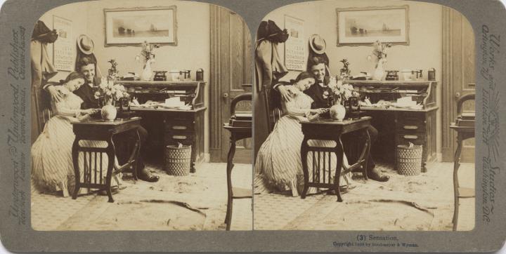 Stereofotografiekarte, monochrom Büroszene; Vorgesetzter mit Sekretärin und Blumen; Text (3): Sensation. Copyright 1899 by Strohmeyer & Wyman