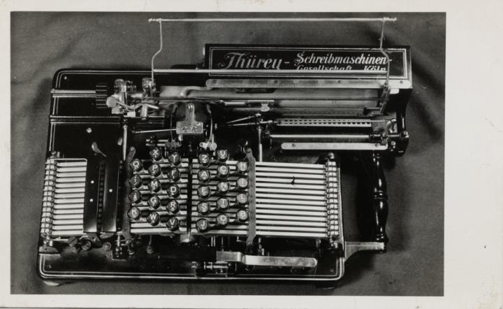 Werbepostkarte; Fotografie, monochrom; Leonar 79 Rückseite: Schreibmaschine mit geteiltem Tastaturfeld, Aufschrift Thüreu Schreibmaschinengesellschaft Köln Vorderseite nicht beschrieben