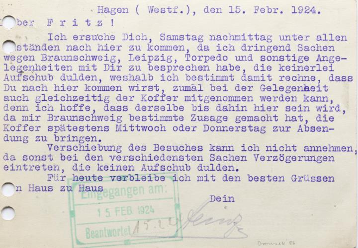 Postkarte mit Werbebild; Grafik, polychrom Vorderseite: Frau mit Schreibmaschine Torpedo; adressiert an Firma Fr. Thielmann, Schwelm; Briefmarke Deutsches Reich 5 Pf.; Poststempel Hagen 15.2.24 Rückseite: mit Schreibmaschine beschrieben, datiert 15. Februar 1924