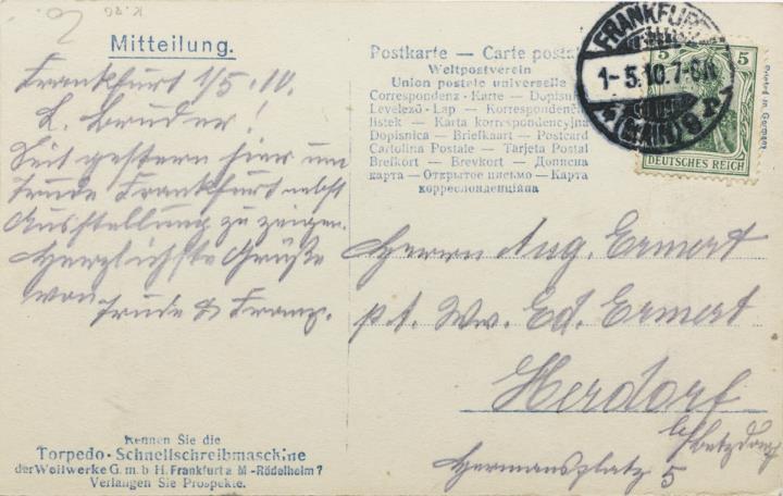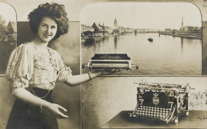 Werbepostkarte; Fotografie, monochrom Rückseite: Frau mit Schreibmaschine Torpedo und abgenommenen Schreibmaschinenwagen, dahinter Stadt-/Flussansicht Vorderseite: beschrieben; adressiert an Herrn Ermert, Herdorf; Briefmarke Deutsches Reich 5 Pf.; Poststempel 1-5.1910