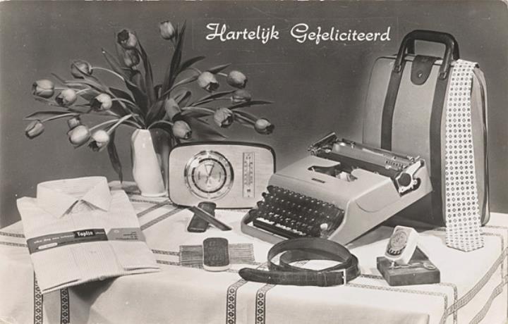 Illustrierte Postkarte; Fotografie, monochrom Rückseite: Kofferschreibmaschine Olivetti neben Blumen, Transistorradio, Kravatte u. a. Vorderseite: beschrieben, adressiert; Briefmarke Nederland 4 Cent; Poststempel Hellevoetsluis