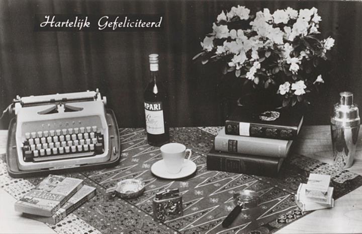 Illustrierte Postkarte; Fotografie, monochrom Rückseite: Schreibmaschine Triumph neben Blumen, Büchern, Zigaretten u.a. Vorderseite nicht beschrieben