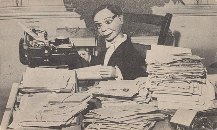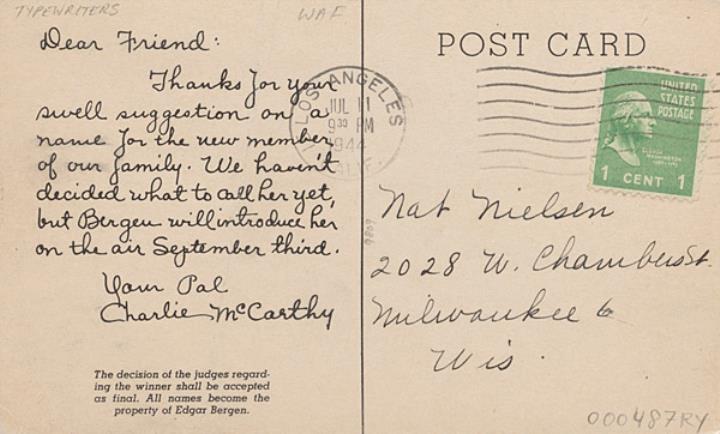 Illustrierte Postkarte; Fotografie, monochrom Rückseite: Holzpuppe des Bauchredners Edgar Bergen mit Schreibmaschine Vorderseite: beschrieben, adressiert an Mr. Nielsen, Milwaukee; Briefmarke U.S. Postage 1 Cent; Poststempel Los Angeles/ Jul 11 1944