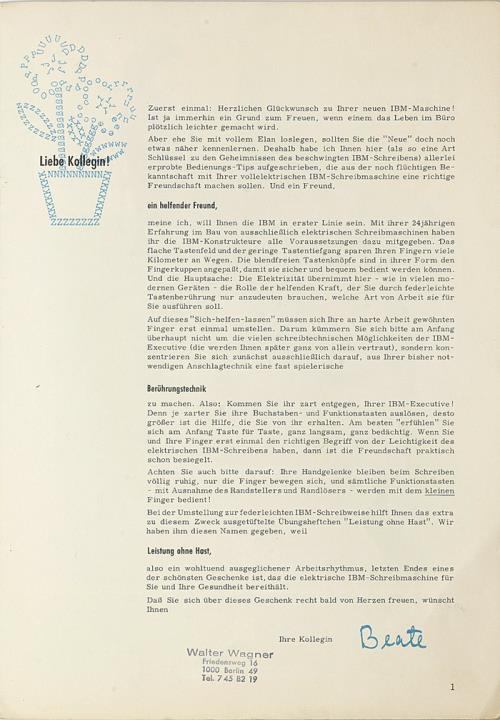 Next to literature on the history of technology, of the typewriter and the office, the Archive holds patent letters, textbooks and instruction manuals as well as historical postcards, letters, photographs and various kinds of advertising (leaflets and brochures, advertising stamps, newspaper ads, posters and signs, promotional gifts).