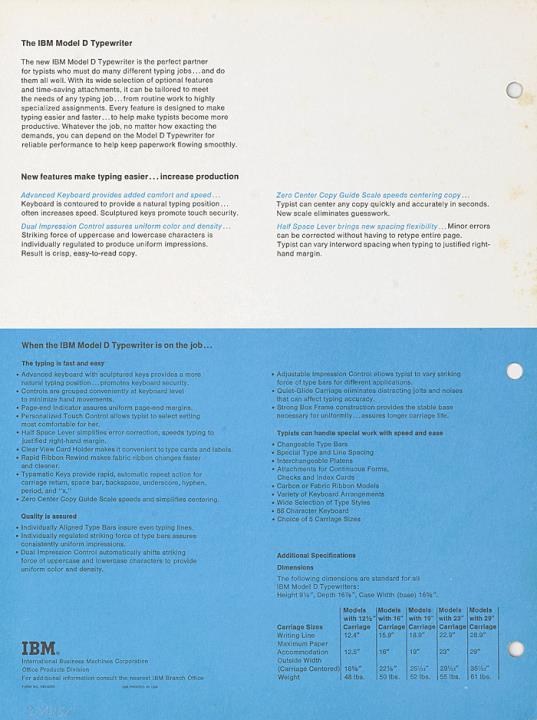 Prospekt für Schreibmaschine IBM Modell D Nr. 543-0055