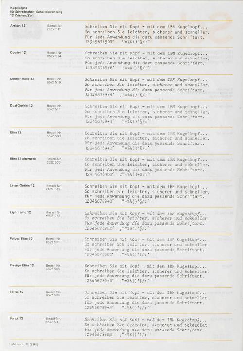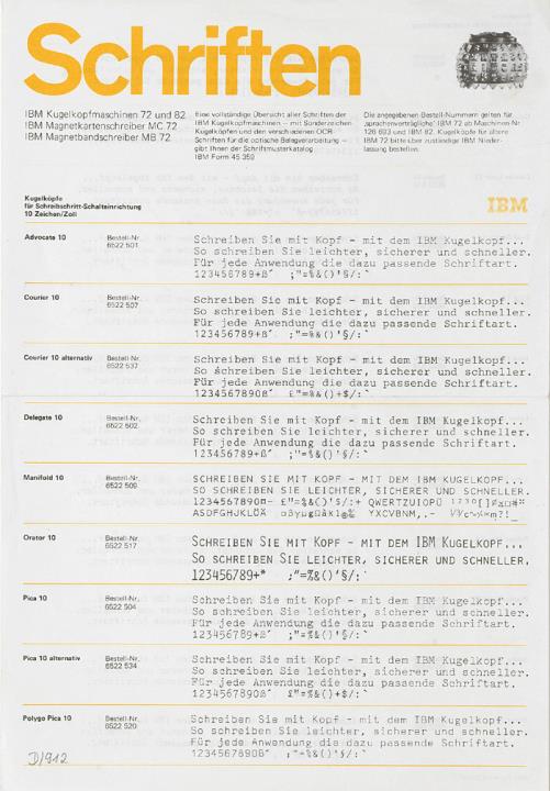 Schriftartenverzeichnis für IBM Kugelkopfmaschine 72 und 82, Magnetkartenschreiber MC 72, Magnetbandschreiber MB 72 Nr. 45 316-9