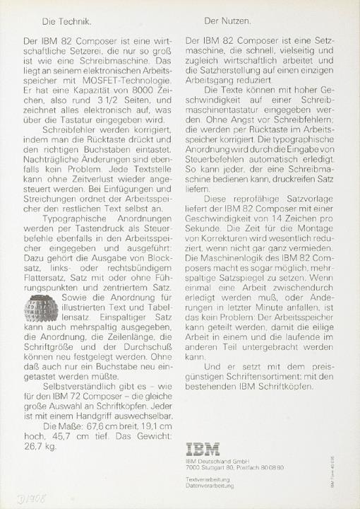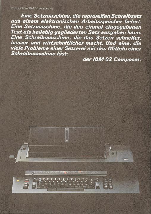 Prospekt für Kugelkopfschreibmaschine IBM 82 Composer Eine Setzmaschine, die reproreifen Schreibsatz aus einem elektronischen Arbeitsspeicher liefert [...] Nr. 45095