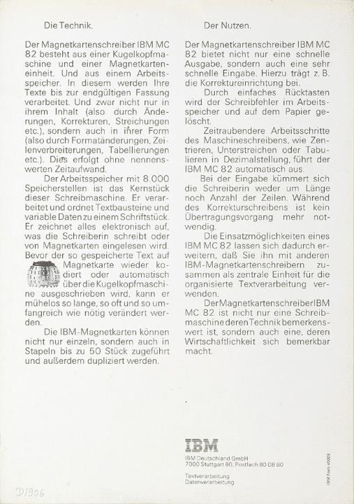 Prospekt für Schreibmaschine IBM MC 82 Eine Schreibmaschine, die den Kugelkopf und die Magnetkarte durch einen Arbeitsspeicher noch effektiver macht [...] Nr. 45008