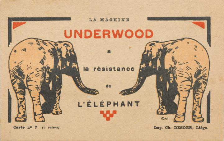 Werbepostkarte; Grafik, polychrom; Carte n. 7, Grafik: I. Cerf Rückseite: zwei Elefanten, die Köpfe einander zugeneigt Vorderseite: Werbetext, adressiert an Monsieur Colin, Bruxelles; Briefmarke Postes Belgique 1 c; Poststempel Liege/1912