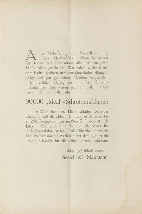 Next to literature on the history of technology, of the typewriter and the office, the Archive holds patent letters, textbooks and instruction manuals as well as historical postcards, letters, photographs and various kinds of advertising (leaflets and brochures, advertising stamps, newspaper ads, posters and signs, promotional gifts).